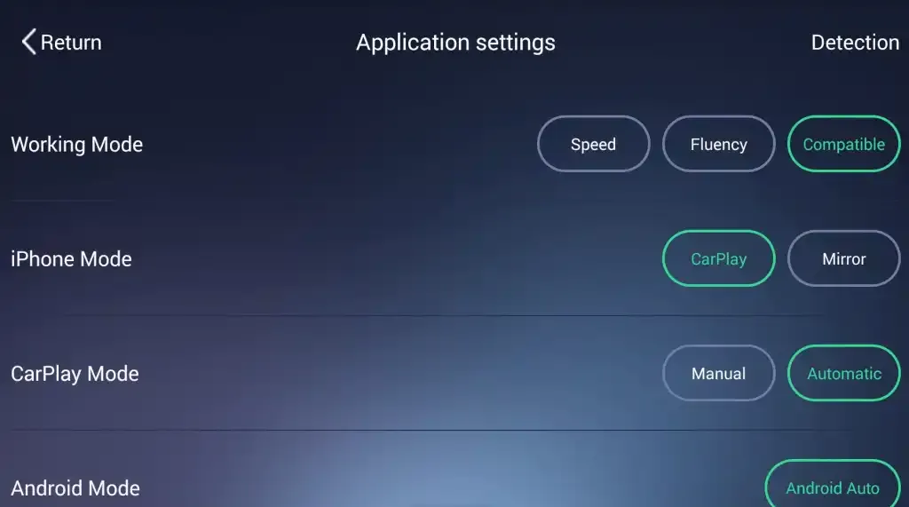 Settings With the AutoKit application, there are many settings to configure, some of these settings are vital for having the app function correctly and some are cosmetic. The setting you may need to play around with is the working mode setting, this setting changes the way the app communicates with the CarPlay dongle. The speed mode is the fastest mode but does have issues with some devices like the Raspberry Pi where it stutters due to the low CPU performance, fluency mode works on some other devices but threw an error screen on the Pi, compatible mode is the slowest mode but it works correctly on the Pi. Another option of note is the ability to change the logo of the exit button in CarPlay, there is a number of popular brands and other icons to choose from.